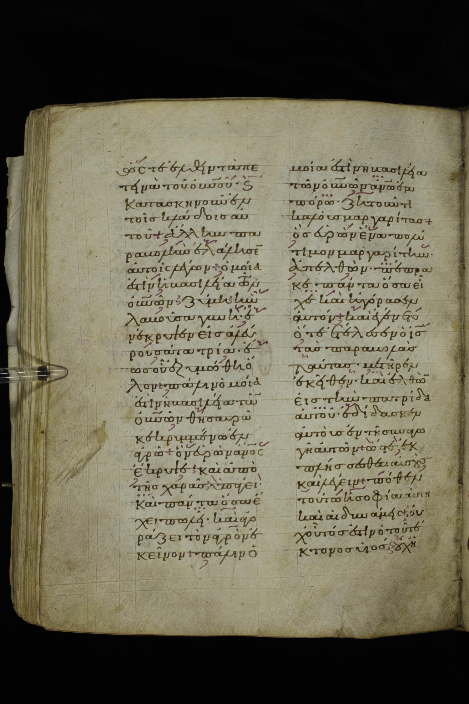 Twelfth century lectionary of the Gospels on parchment; 220 leaves, 2 columns, 24 lines per column. Images were taken at the National Library of Greece in Athens.