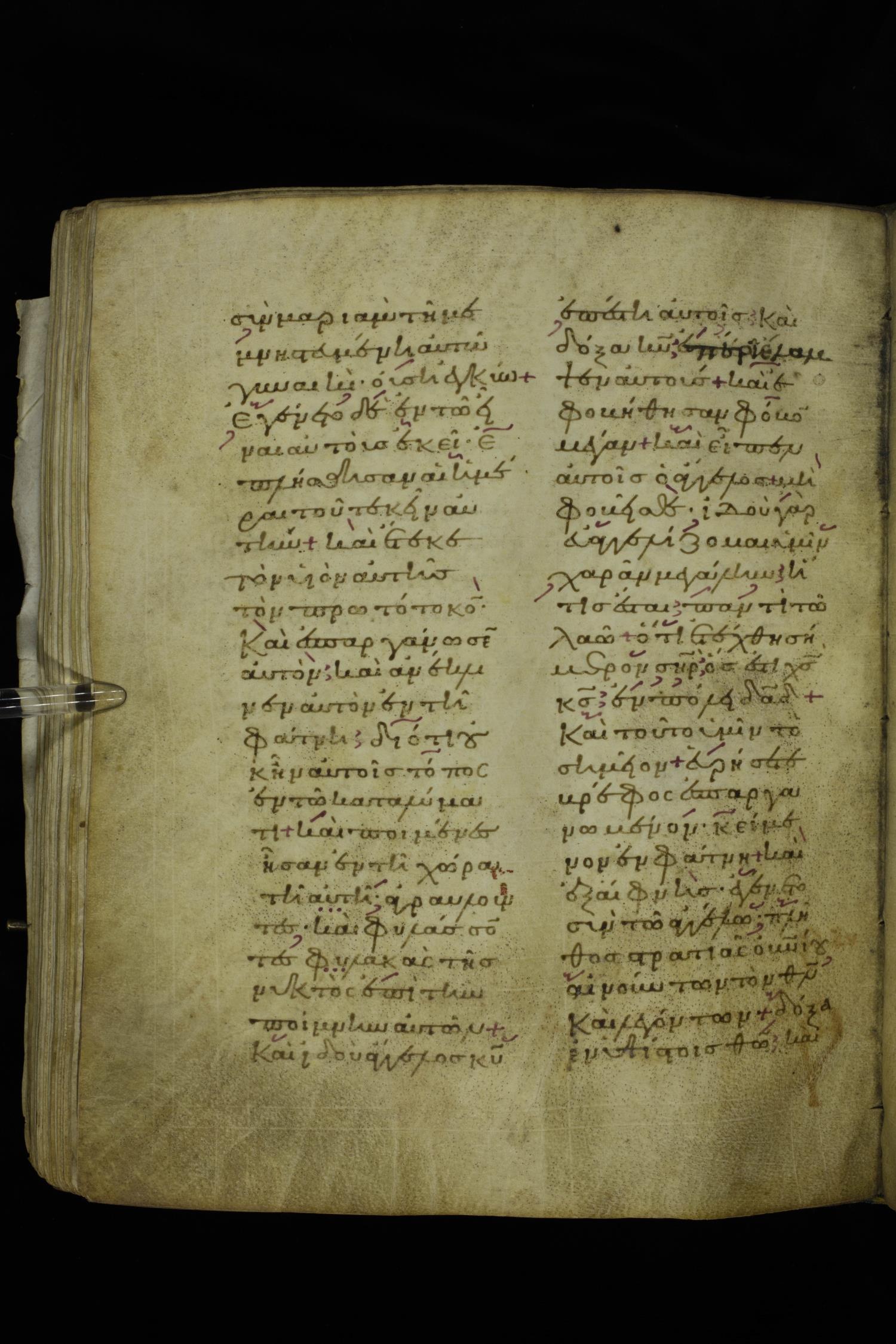 Twelfth century lectionary of the Gospels on parchment; 220 leaves, 2 columns, 24 lines per column. Images were taken at the National Library of Greece in Athens.