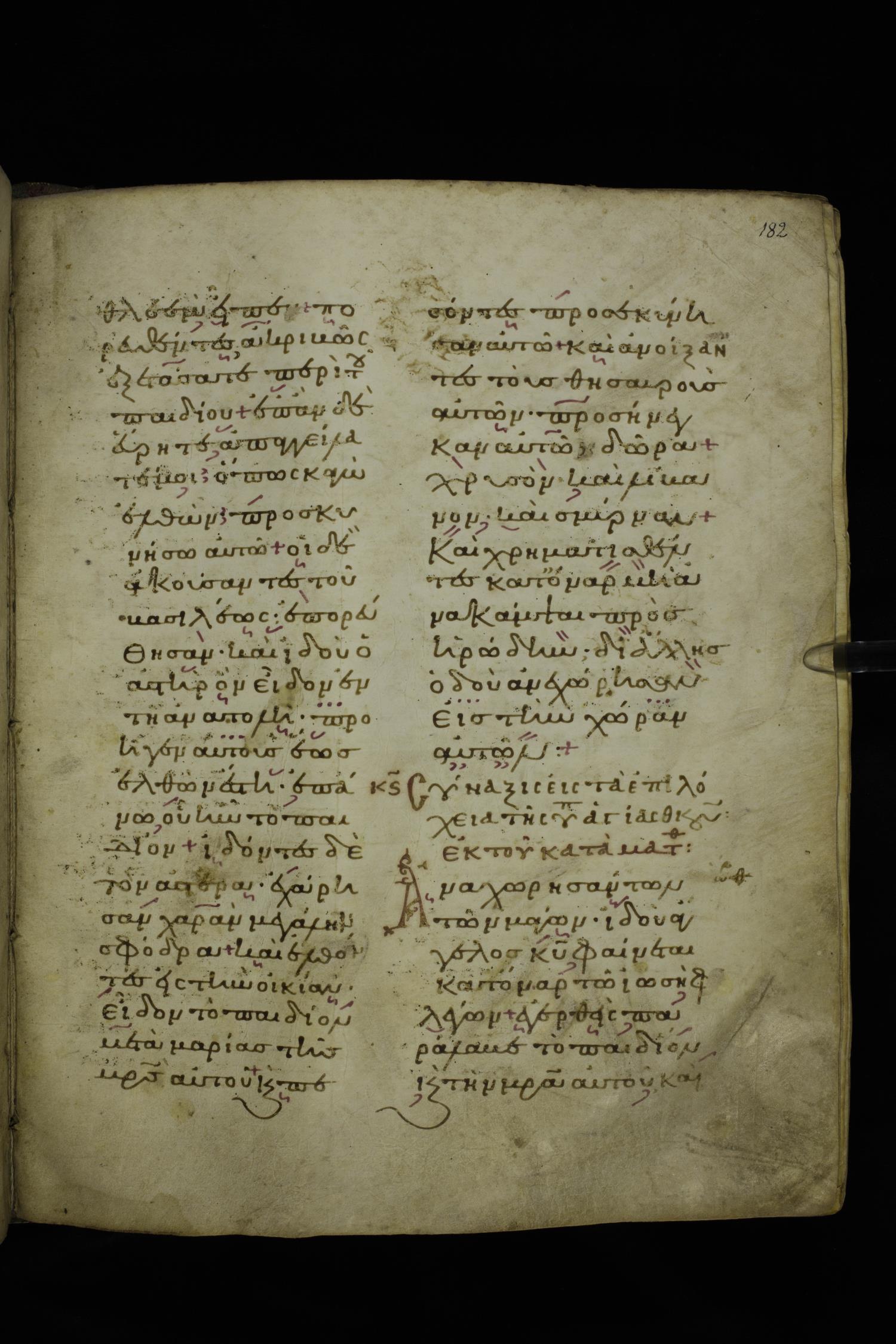 Twelfth century lectionary of the Gospels on parchment; 220 leaves, 2 columns, 24 lines per column. Images were taken at the National Library of Greece in Athens.