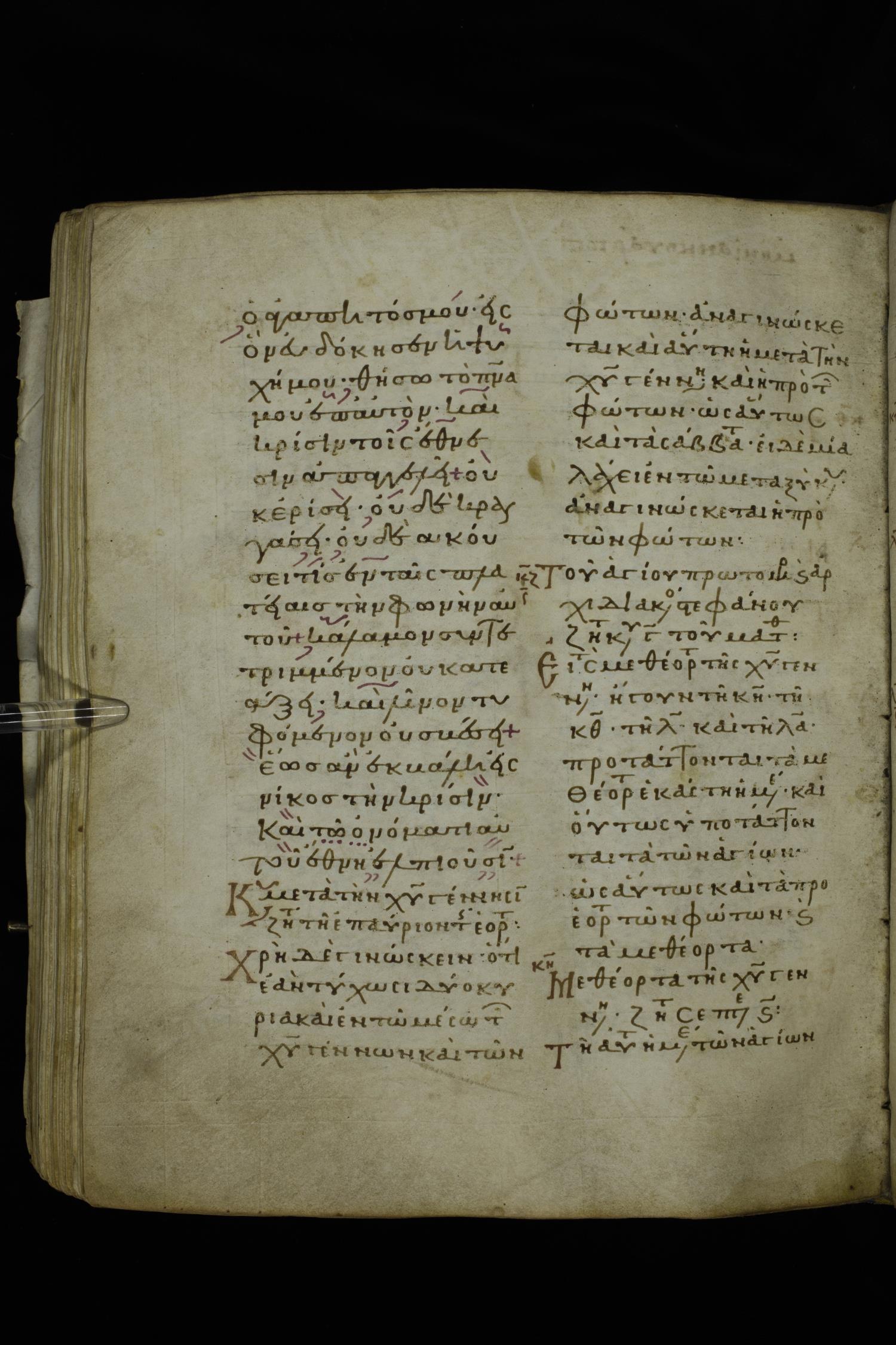 Twelfth century lectionary of the Gospels on parchment; 220 leaves, 2 columns, 24 lines per column. Images were taken at the National Library of Greece in Athens.