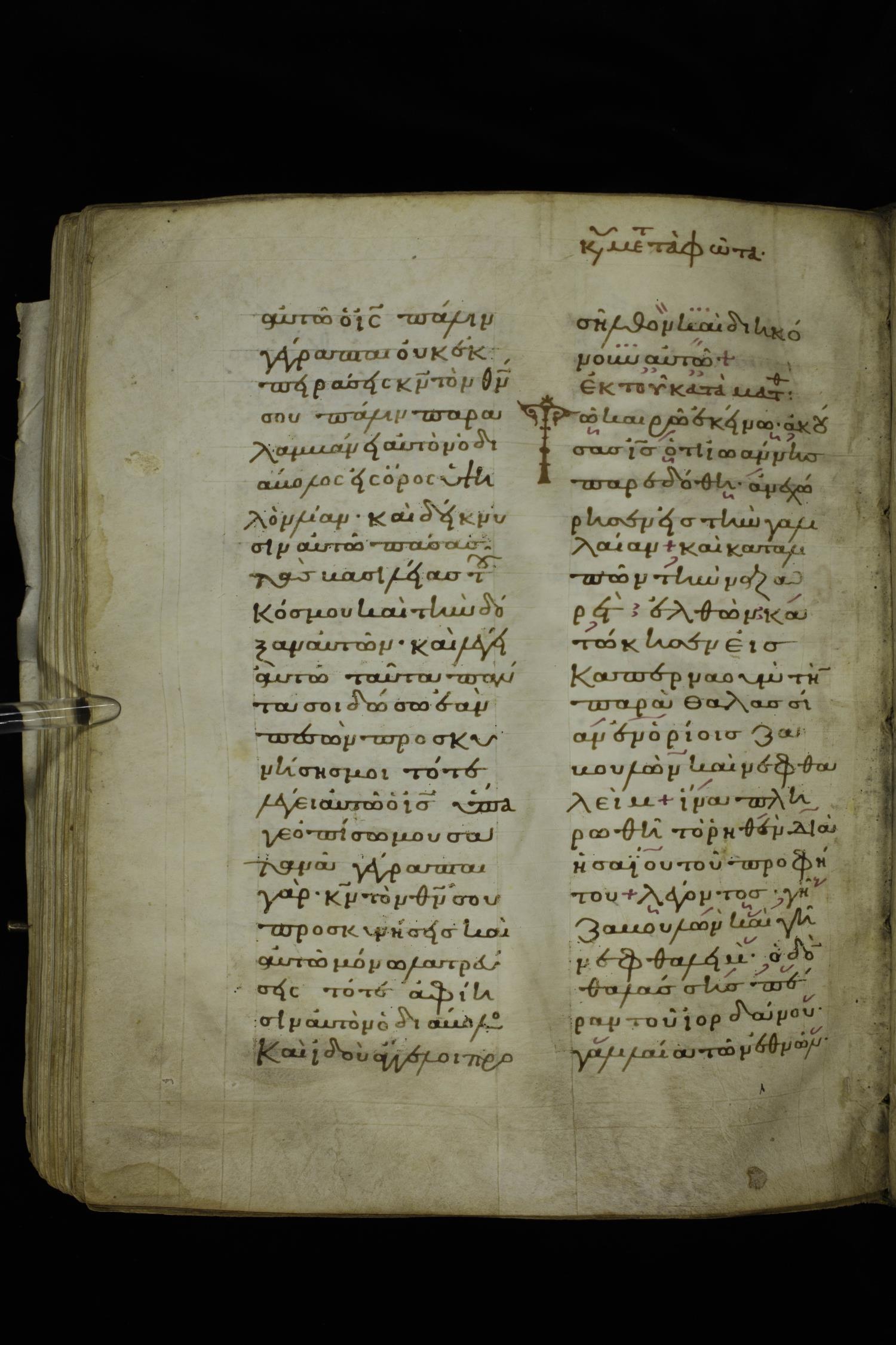 Twelfth century lectionary of the Gospels on parchment; 220 leaves, 2 columns, 24 lines per column. Images were taken at the National Library of Greece in Athens.