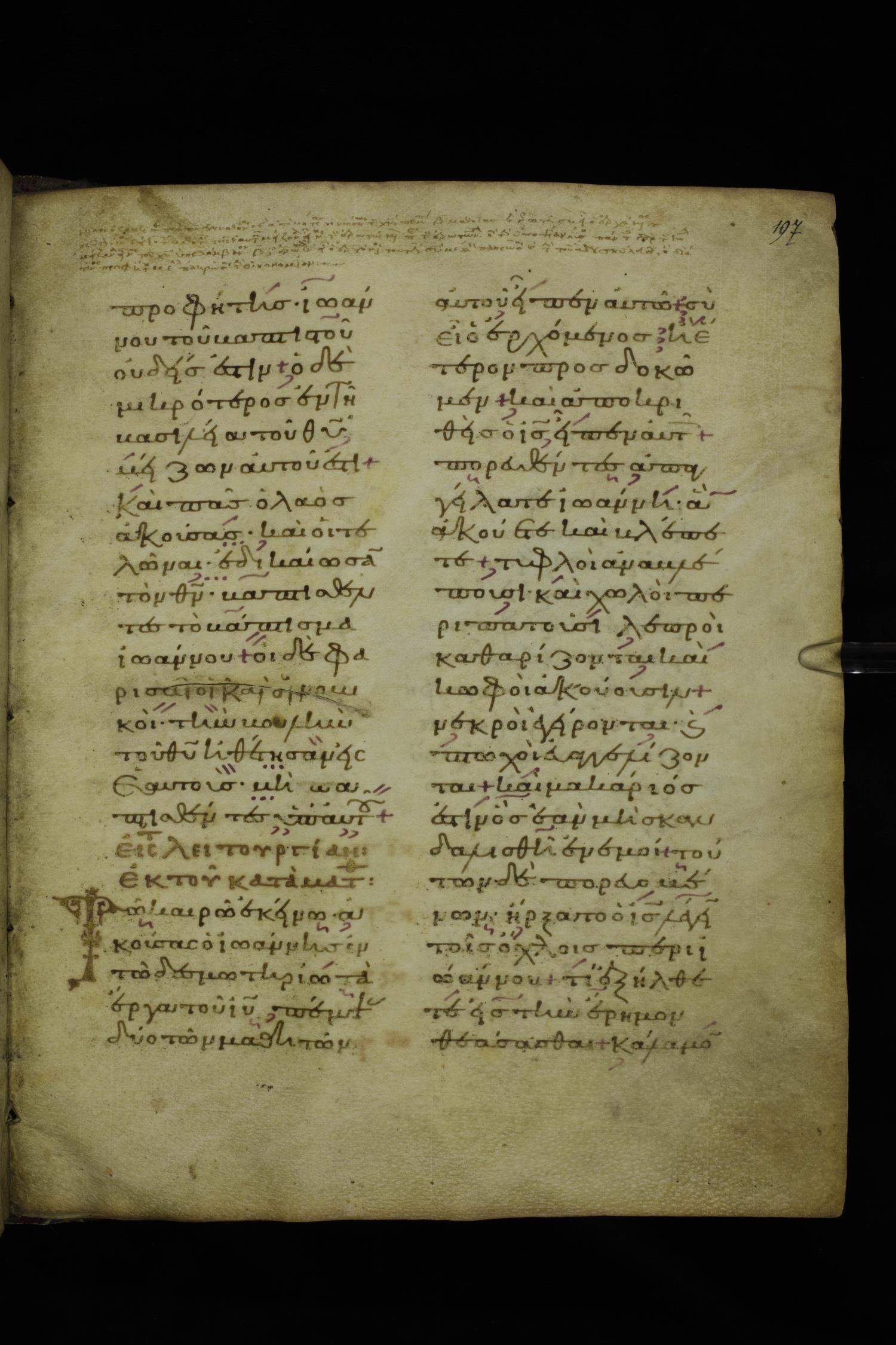 Twelfth century lectionary of the Gospels on parchment; 220 leaves, 2 columns, 24 lines per column. Images were taken at the National Library of Greece in Athens.