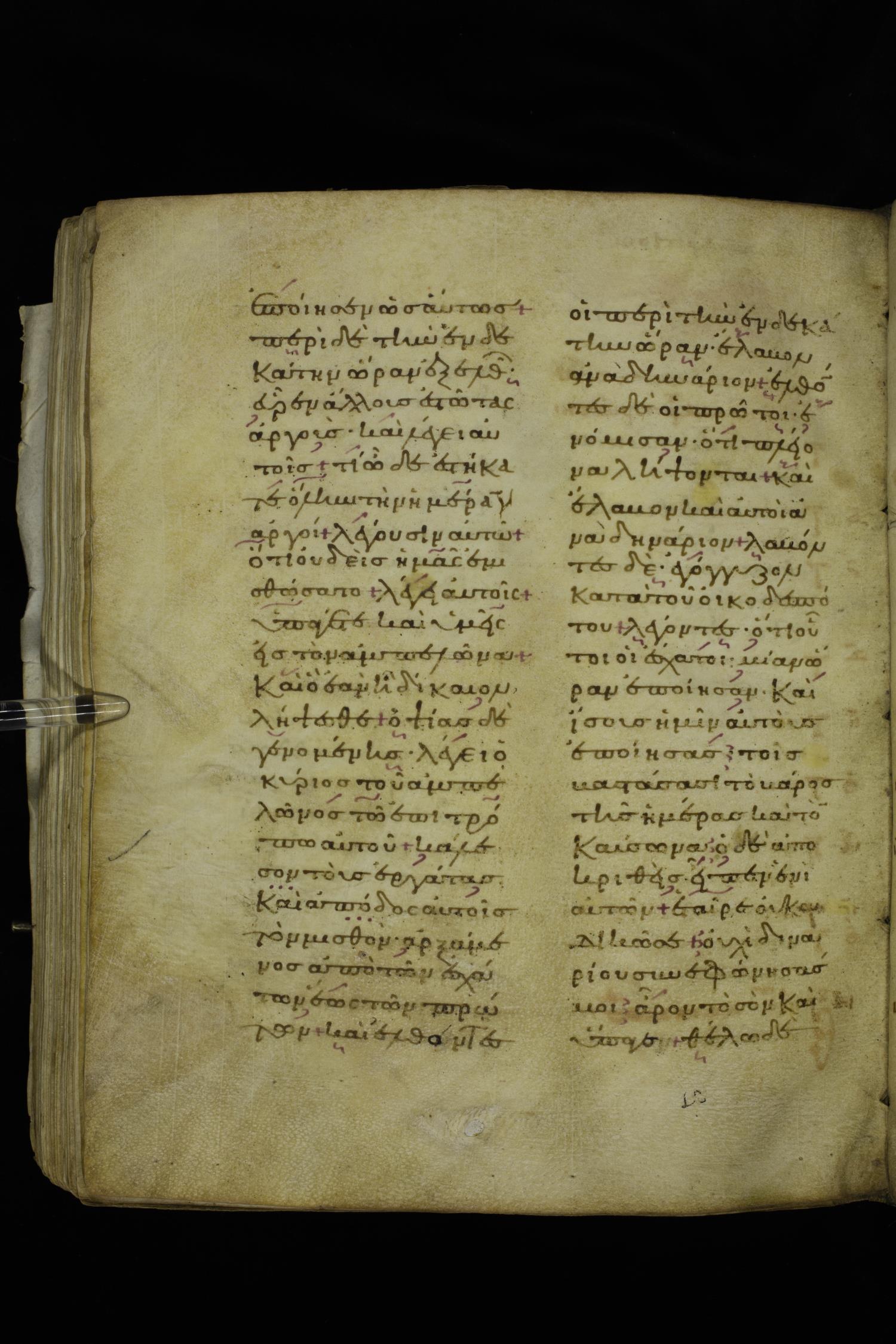 Twelfth century lectionary of the Gospels on parchment; 220 leaves, 2 columns, 24 lines per column. Images were taken at the National Library of Greece in Athens.