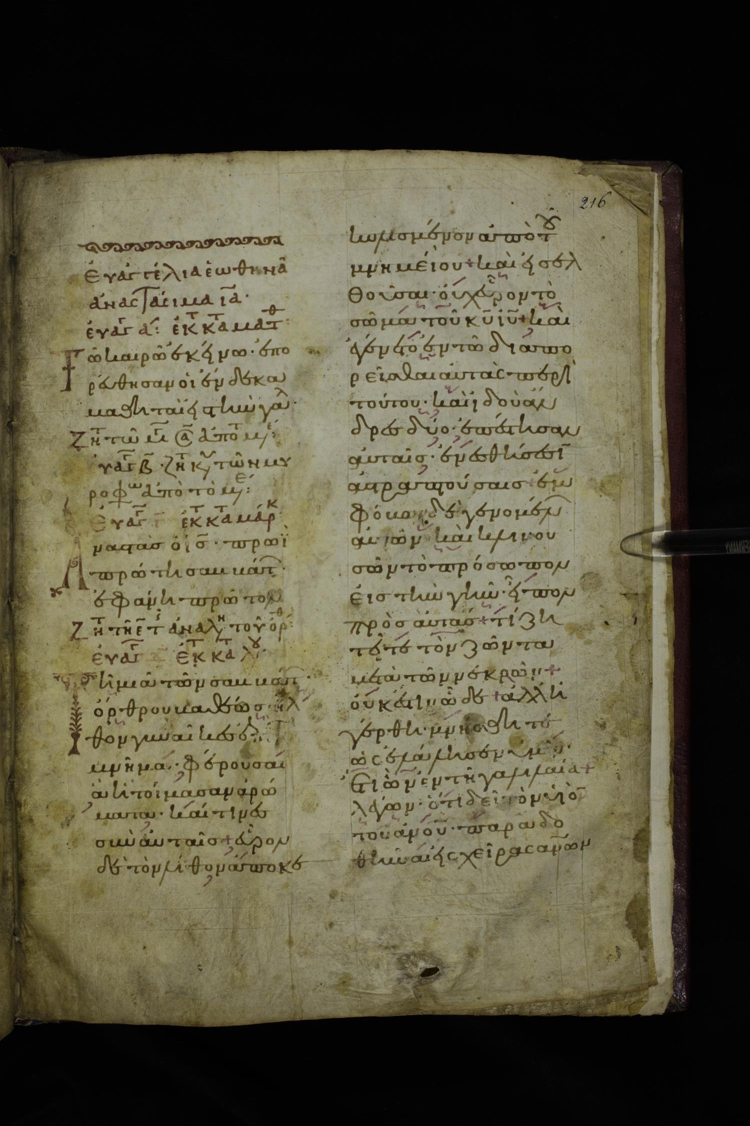 Twelfth century lectionary of the Gospels on parchment; 220 leaves, 2 columns, 24 lines per column. Images were taken at the National Library of Greece in Athens.