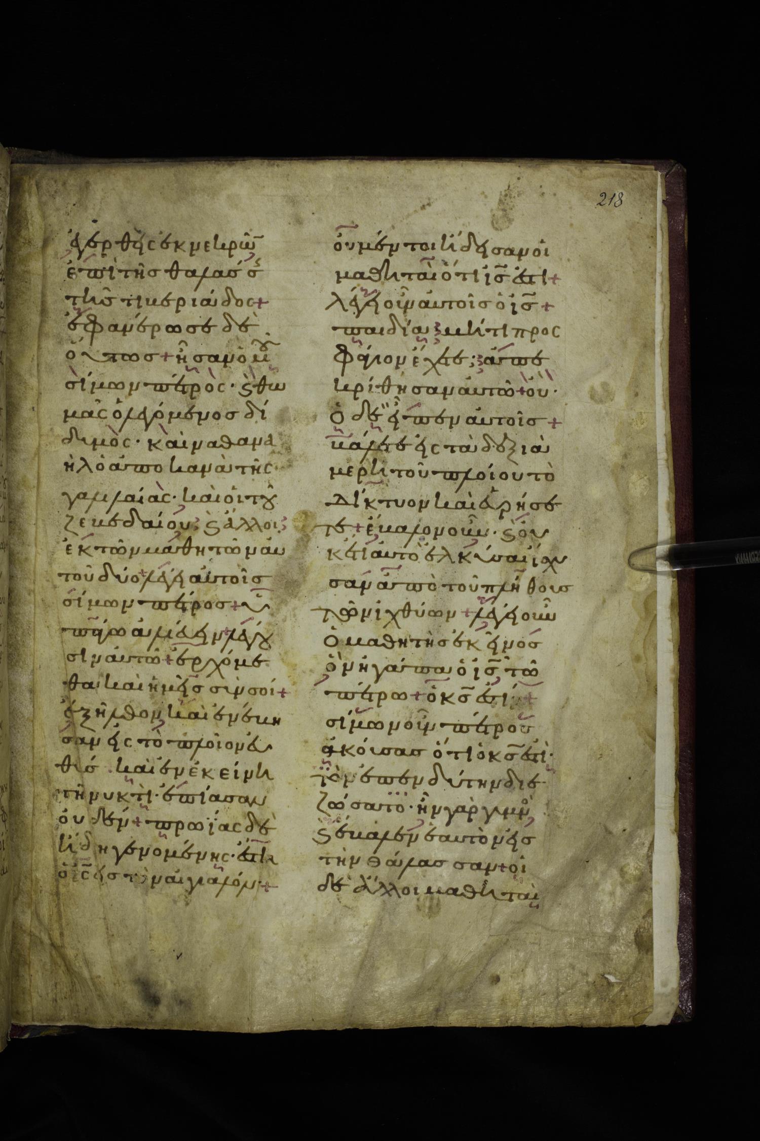 Twelfth century lectionary of the Gospels on parchment; 220 leaves, 2 columns, 24 lines per column. Images were taken at the National Library of Greece in Athens.