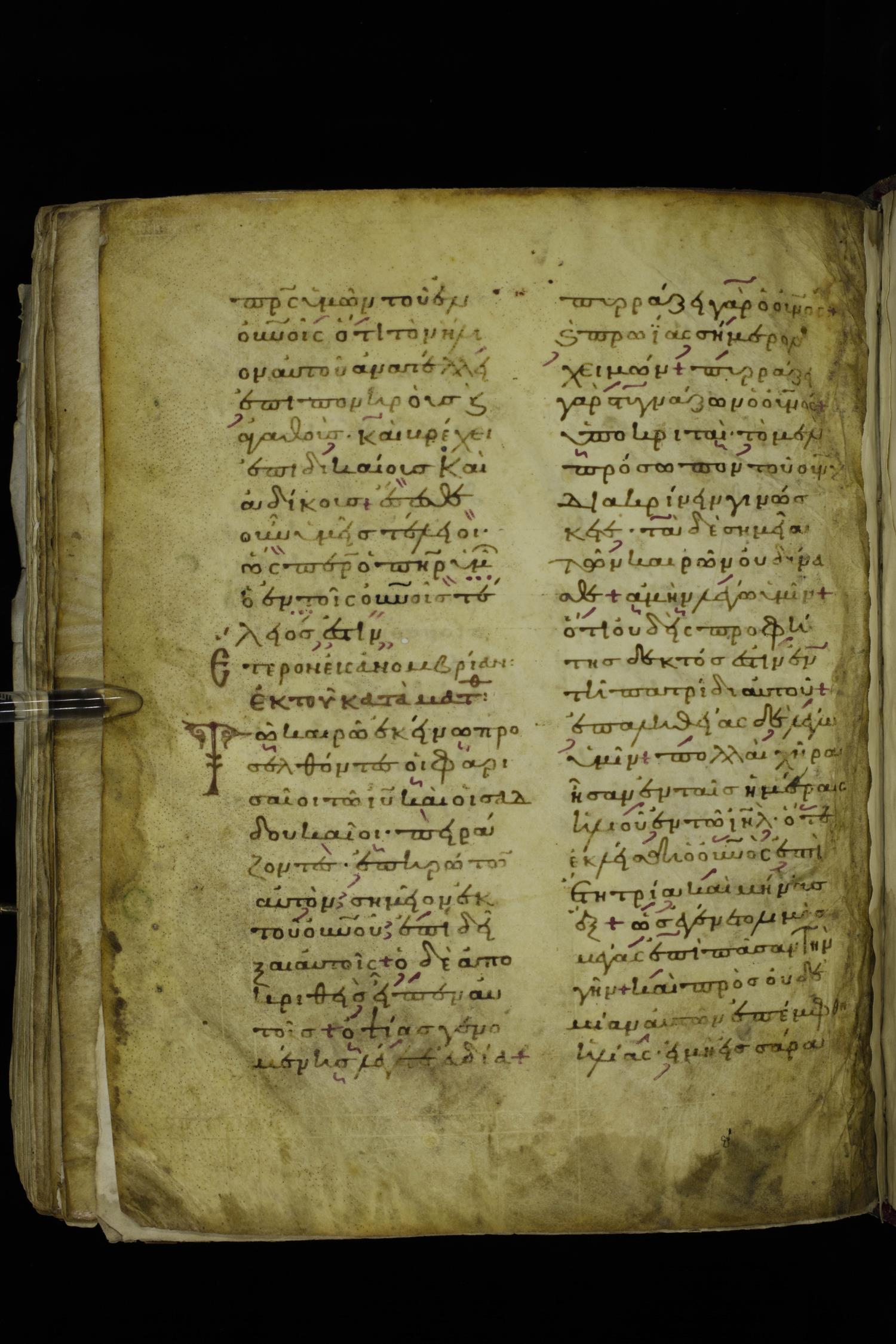 Twelfth century lectionary of the Gospels on parchment; 220 leaves, 2 columns, 24 lines per column. Images were taken at the National Library of Greece in Athens.