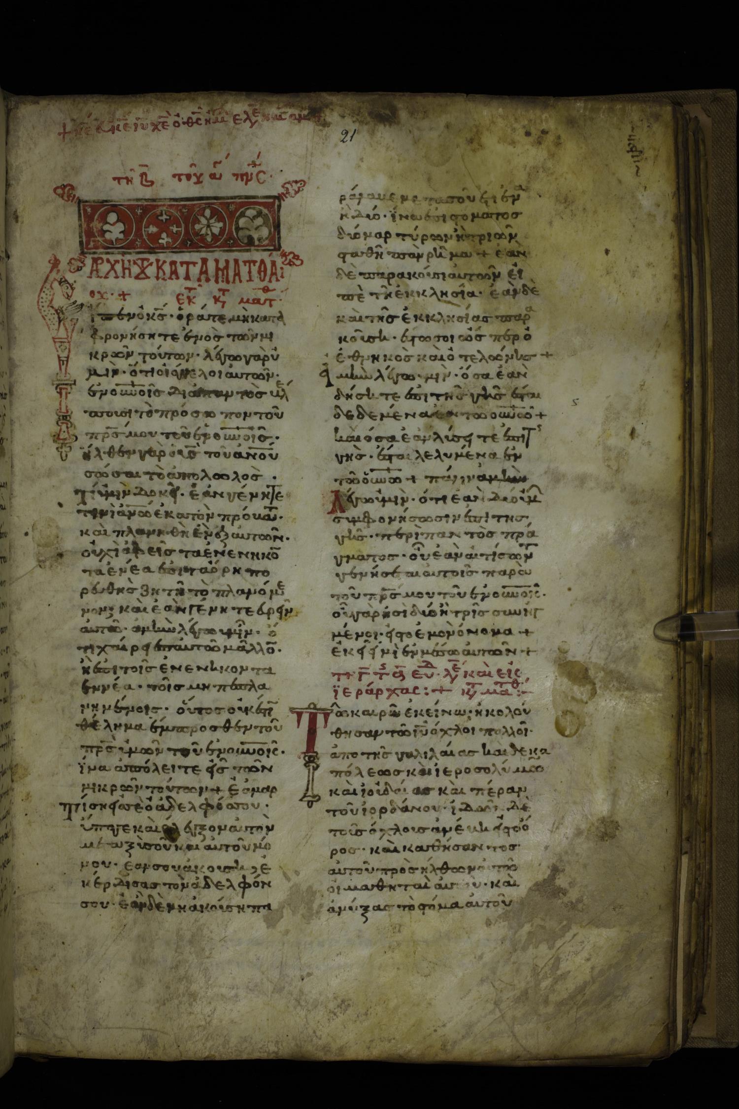 Twelfth century lectionary of the Gospels on parchment; 106 leaves, 2 columns, 31-39 lines per column. Images were taken at the National Library of Greece in Athens.