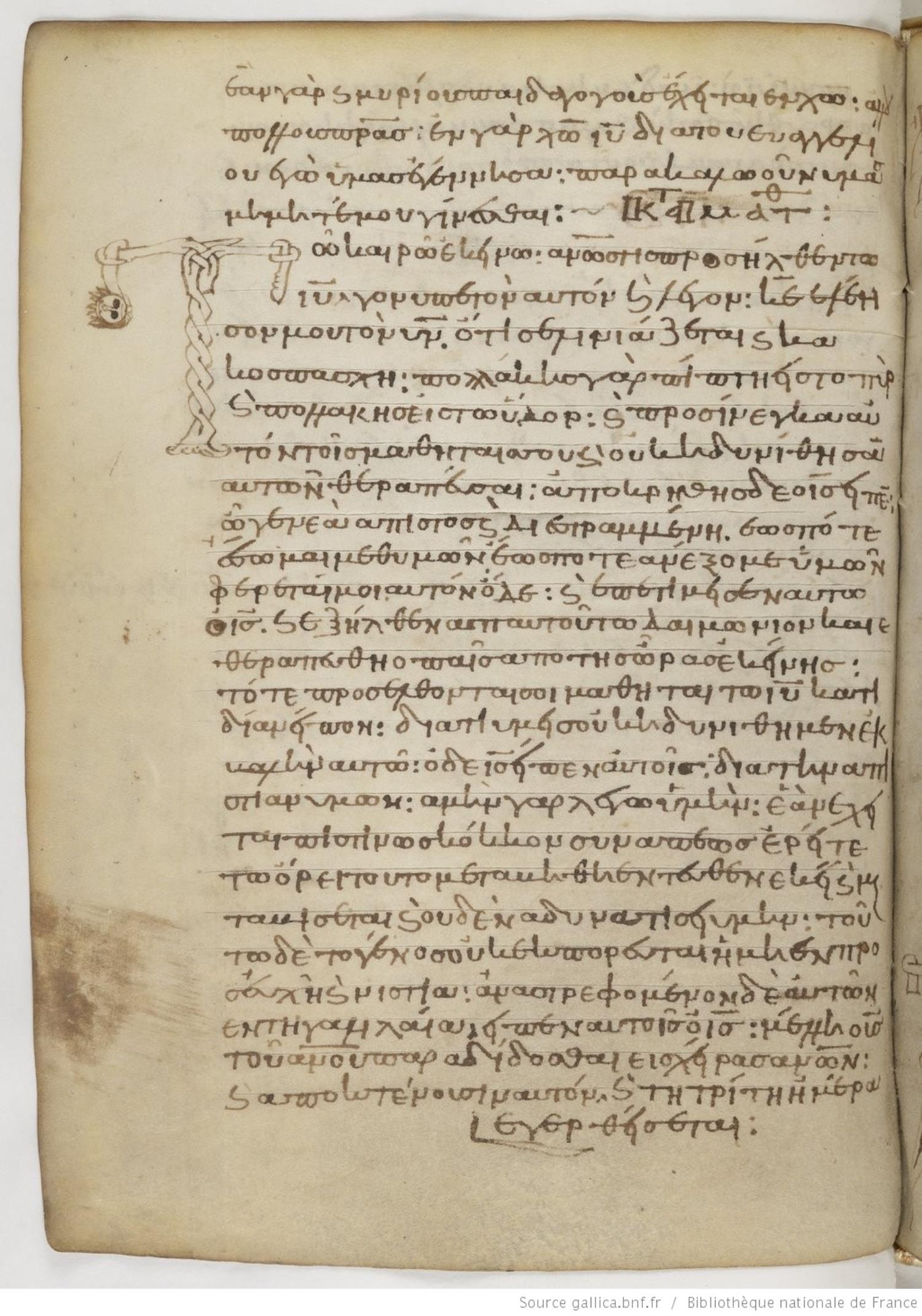 Eleventh century dated to (1021) minuscule lectionary on parchment; 195 leaves, single column, 28 lines per column. Contents: lectionary contains the Apostolos, Gospels, and weekday readings from Easter to Pentecost, and Saturday and Sunday readings for other weeks. For recent images, please visit the Bibliothèque Nationale
