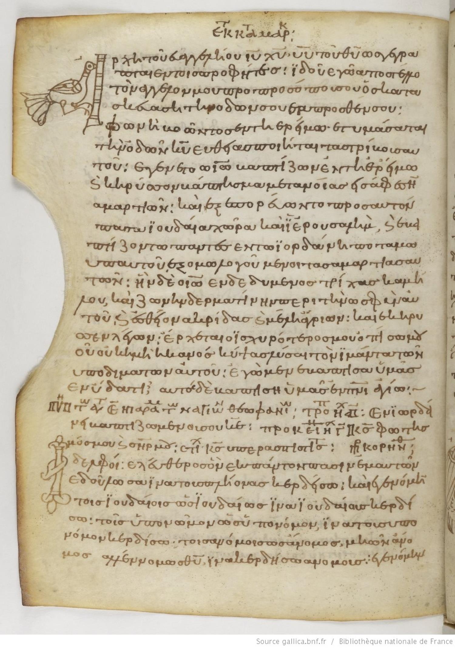 Eleventh century dated to (1021) minuscule lectionary on parchment; 195 leaves, single column, 28 lines per column. Contents: lectionary contains the Apostolos, Gospels, and weekday readings from Easter to Pentecost, and Saturday and Sunday readings for other weeks. For recent images, please visit the Bibliothèque Nationale