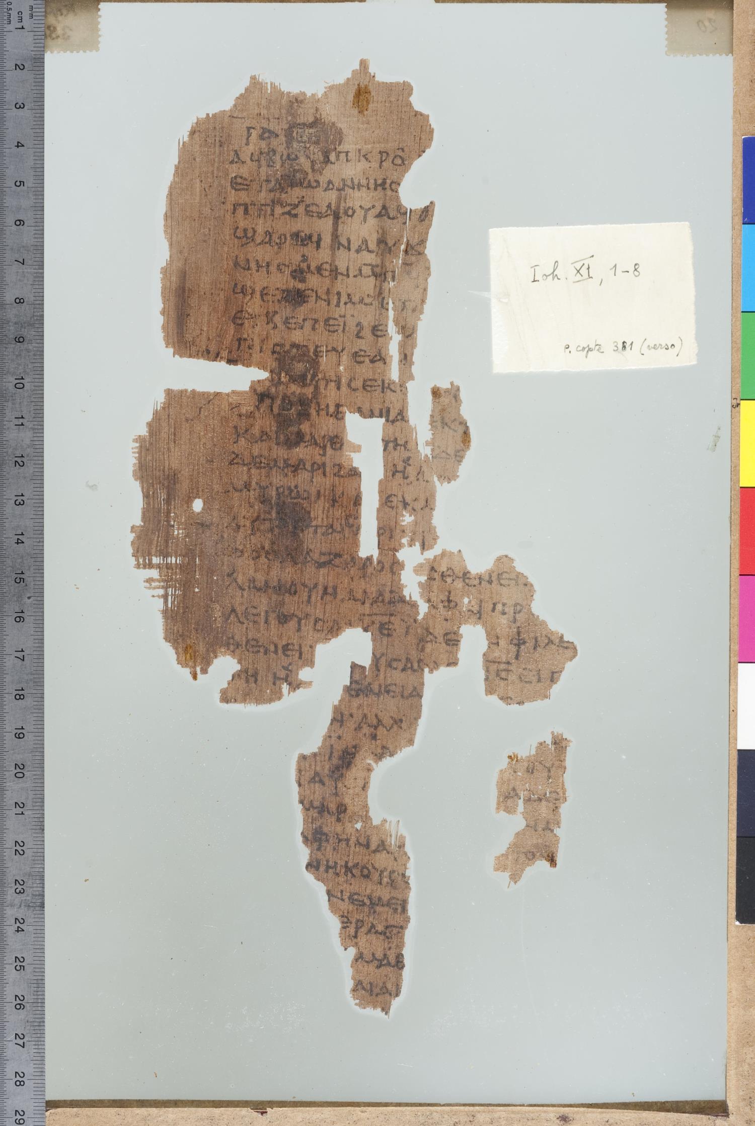 Fourth century manuscript of the Gospels on papyrus; Greek-Coptic diglot; 15 fragments, single column, approximately 30 lines per column.