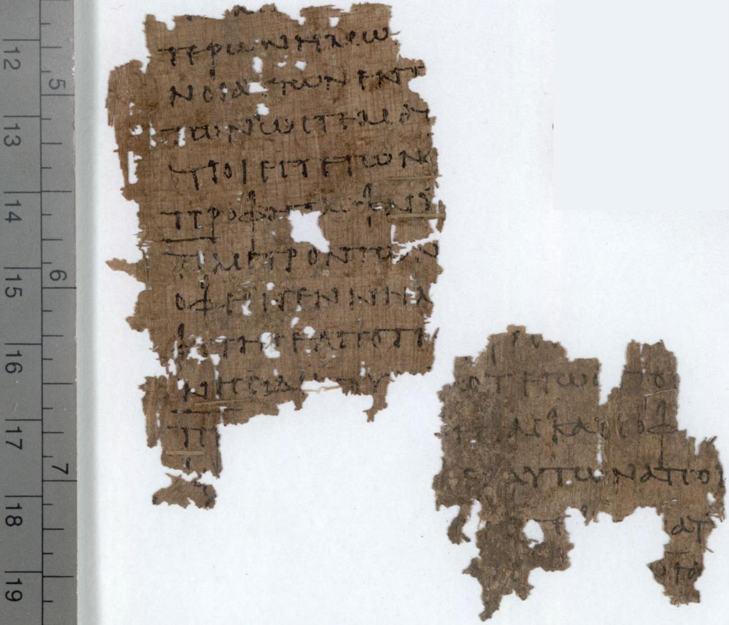 Second or third century manuscript of the Gospels on papyrus; 1 leaf (2 fragments), single column, 13 lines per column. Images are made available by the Oxford Imaging Papyri Project. For recent digital images visit Oxyrhynchus Online.