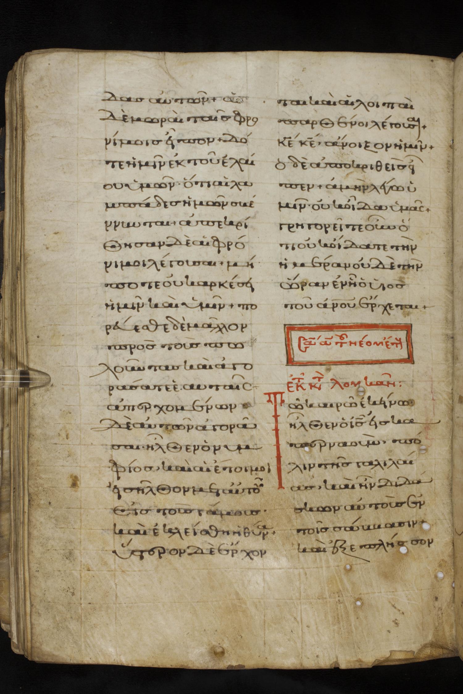 Thirteenth or fourteenth century lectionary of the Gospels on parchment, with sixteenth or seventeenth century leaves on paper; 196 leaves, 2 columns, 26-27 lines per column. Images were taken at the National Library of Greece in Athens.