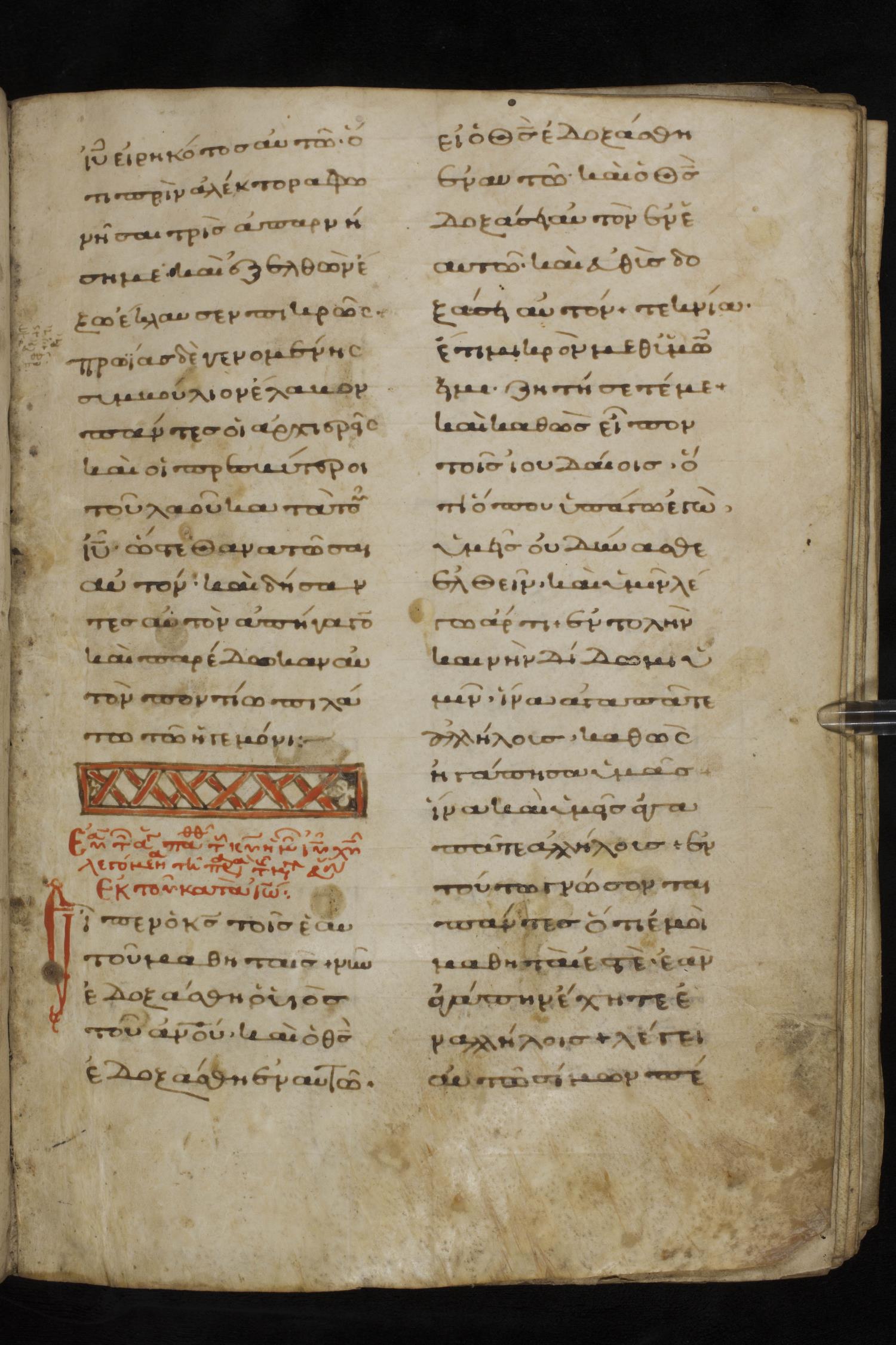 Thirteenth or fourteenth century lectionary of the Gospels on parchment, with sixteenth or seventeenth century leaves on paper; 196 leaves, 2 columns, 26-27 lines per column. Images were taken at the National Library of Greece in Athens.