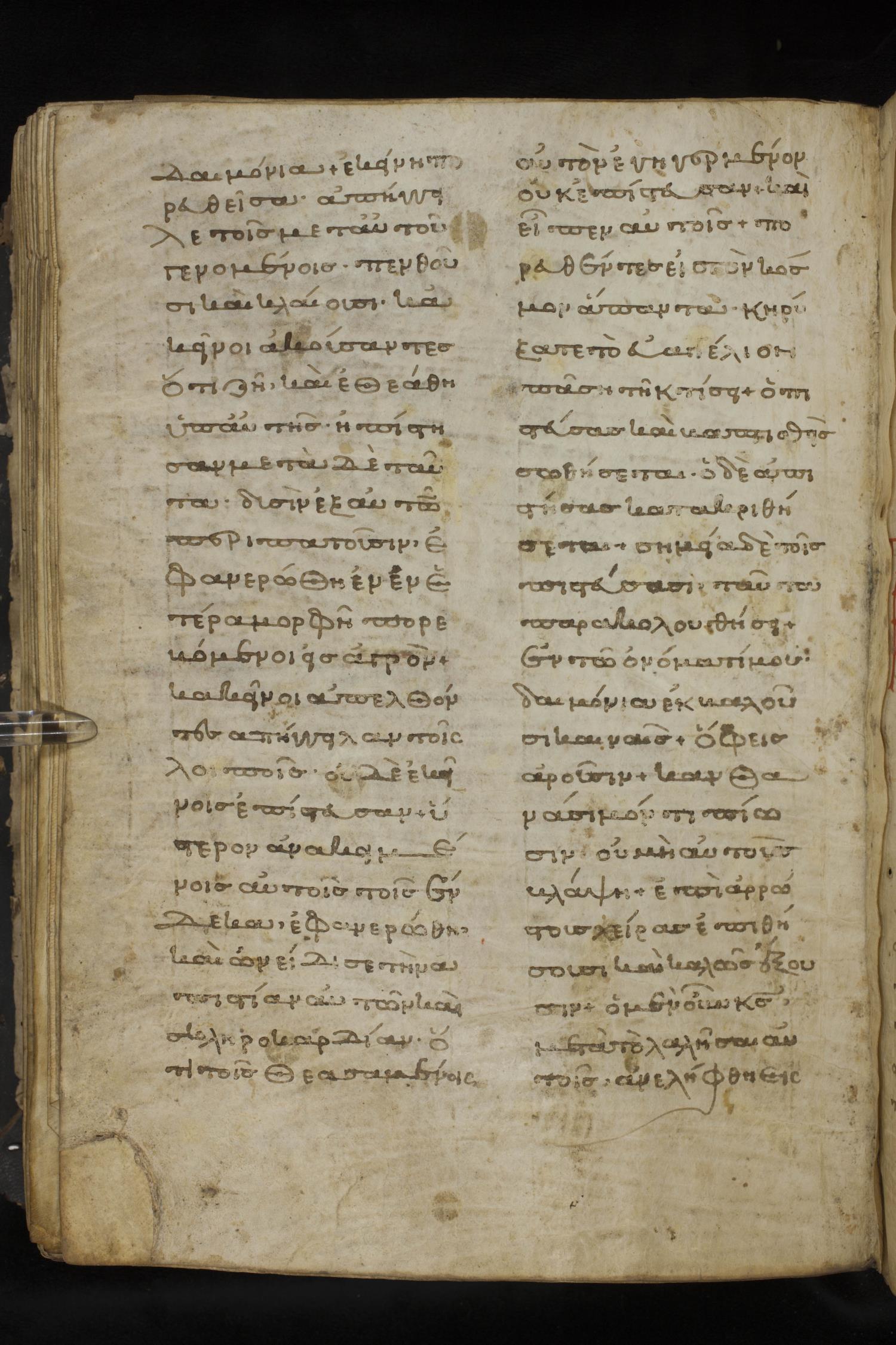 Thirteenth or fourteenth century lectionary of the Gospels on parchment, with sixteenth or seventeenth century leaves on paper; 196 leaves, 2 columns, 26-27 lines per column. Images were taken at the National Library of Greece in Athens.